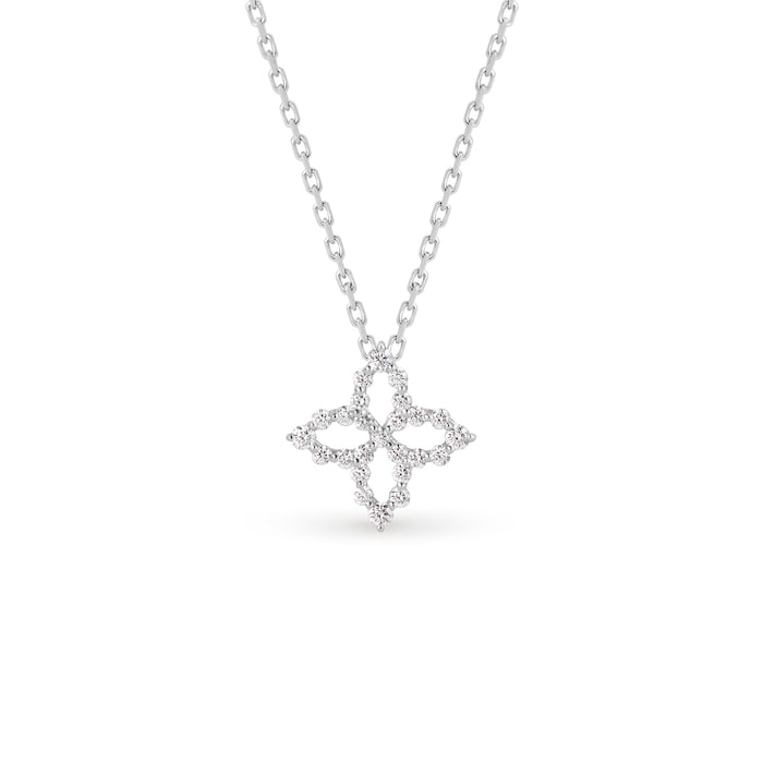 Diamonds illuminate this cute floral necklace by Roberto Coin, featuring 18ct white gold and the magnificence of a handmade jewel.