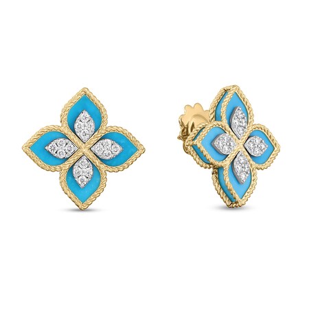 Turquoise is the colour symbol of these romantic floral earrings by Roberto Coin, featuring 18ct yellow gold, diamonds and the uniqueness of a handmade jewel.